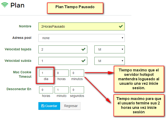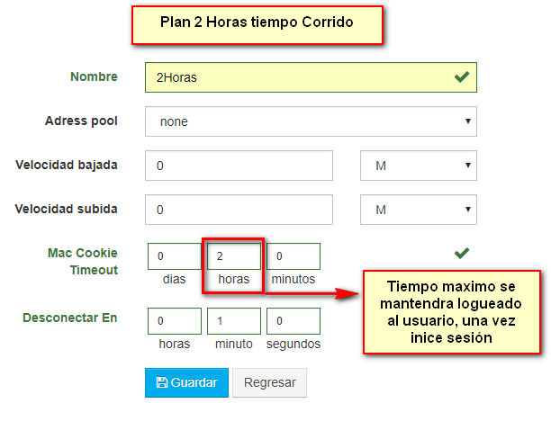 Ejemplo: Tiempo pausado de 2 Horas (Limit-Uptime), pero tiene maximo 1 dia (Mac Cookie Time Out) para terminar completar sus 2 horas una vez inicia sesión.